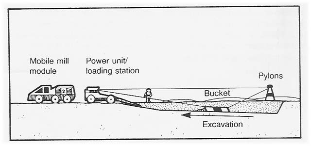 Based on an earlier proposal (Gertsch 1983), the method is a three-drum slusher, also known as a cable-operated drag scraper (Ingersoll-Rand Company 1939, Church 1981). Its terrestrial application is quite limited, as it is relatively inefficient and inflexible.
