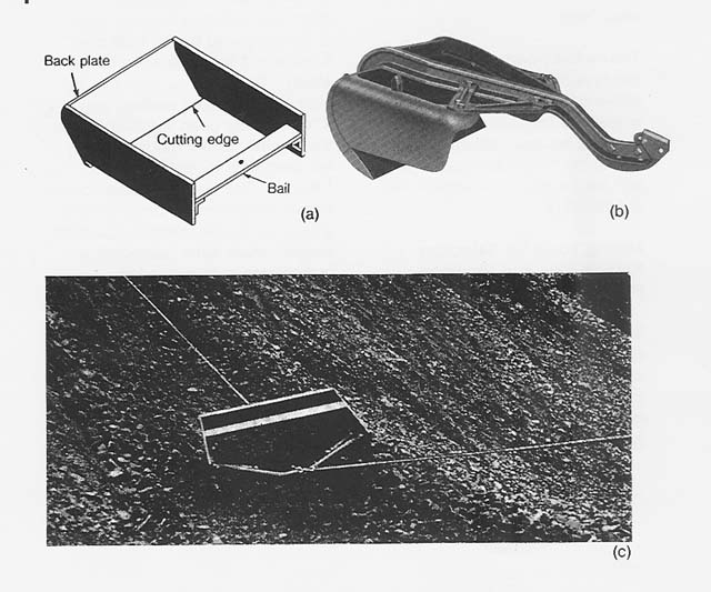Other tools, such as rippers or plows, are used to break difficult ground. Lower levels of lunar regolith appear to have a high degree of compaction (Carrier 1972) and must be broken before mining can take place. Although it is the usual terrestrial practice, chemical explosive blasting appears to be prohibited by the high cost to transport the explosives to the Moon. The ripper or plow greatly increases machine working depth. It has already been established that the slusher, unlike mobile loading equipment, is independent of traction. This traction independence allows the slusher to break difficult ground while still maintaining a light weight. More lunar geotechnical engineering data is needed, however, and the design of the ripper is unknown. The ripper probably needs an attached weight to force it into the regolith. A plow may be better than a ripper, as its shape helps pull it into the soil, making it less gravity dependent.