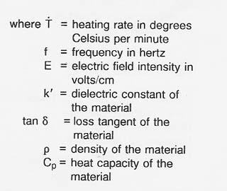 Table A-2 shows observed heating rates for some of the materials thermally processed using 2.45 GHz and 60 GHz microwave energy. If the proper electric field intensity (E) or magnetic field intensity (H) is used, rapid heating of lunar materials will also occur. The following expression (Puschner 1966) shows the relationship between the approximate heating rate and the applied electric field intensity for the heating of an insulator material.