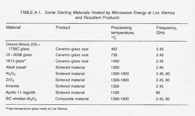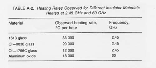 Table A-1 lists some materials that have been thermally processed using microwave energy and some products that have been fabricated at both 2.45 GHz and 60 GHz.