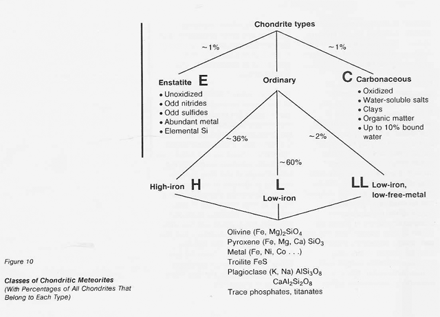 However, more than 95 percent of the chondrites that fall on Earth (about 3/4 of all known meteorites) lie between the extremes represented by the E and C chondrites. These intermediate "ordinary" chondrites are subdivided into three groups according to the total amount of iron they contain and the proportion of that iron (and of the siderophilic elements) that is found as free metal: the H group with high iron content (much of it metallic), the L group with low iron content (less of it metallic), and the LL group with low iron and low free metal content. Table 15 and figure 11 show the compositional relationships among the five major classes of chondrites.