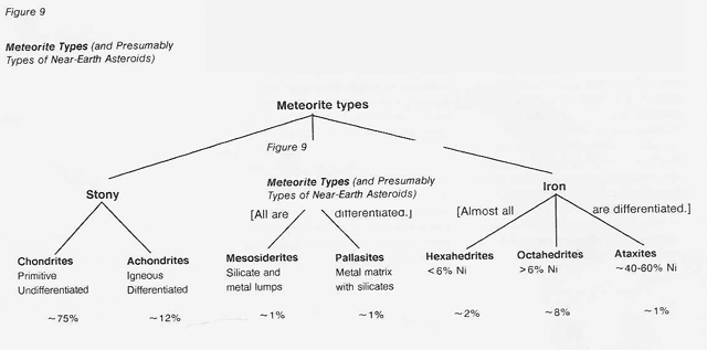 Figure 9 shows the general scheme for classification of meteorites. This scheme unifies the more than 30 known classes under the three principal headings of stones, stony- irons, and irons. Primitive solid material, in which the major rock- forming elements have about the same relative abundances as in the Sun, accounts for the subset of stony meteorites called chondrites. All other classes of meteorites are the results of melting and density-dependent geochemical differentiation of primitive material. Chondrites.fall on Earth far more often than all these other meteorite types combined. The prospect of mining differentiated asteroids is not encouraging. Volatiles are probably rare or absent, and free metals will probably have drained into a massive monolithic core. Conversely, chondritic asteroids, both those with high volatile content and those with high free-metal content, are attractive targets.