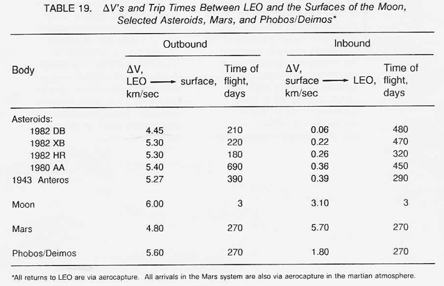 The delta V requirements for the outbound (LEO to surface of body) and inbound (surface of body to LEO) legs and the trip times for asteroidal, lunar I and martian trajectories are compared in table 19. Note that the Mars system is mainly useful for supplying resources to support Mars endeavors. However, return of martian satellite materials to LEO is somewhat more attractive energetically than return of lunar materials to LEO (return delta V's about 40% lower).
