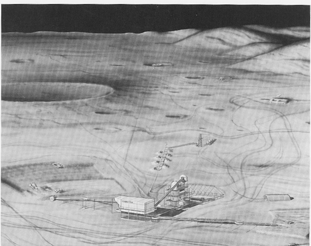 front-end loader scoops up lunar soil from an open pit mine. The soil is