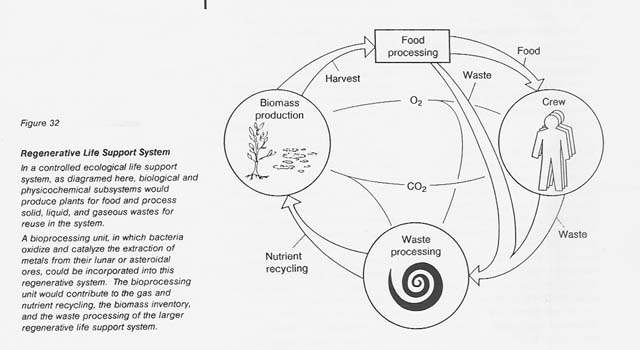 The introduction of the micro- organisms needed for the bioprocessing of lunar ores would probably not be an early event in the establishment of an outpost on the Moon. If a human habitation with recycling (of water, oxygen, carbon dioxide, nitrogen, sulfur, and other essential nutrients) was established, the cultures needed in the mining operation would be useful as part of the microflora of that ecosystem. The thiobacilli and other bacteria involved in the leaching of ores are important in the cycles of sulfur, nitrogen (some fix N2), carbon, and oxygen on Earth (see fig. 32).
