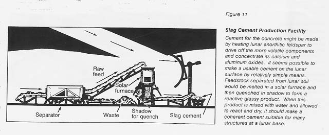 To produce lunar cement, high- temperature processing will be required (see fig. 11). It may be possible to make calcium-rich silicate and aluminate for cement by solar heating of lunar pyroxene and feldspar, or chemical treatment may be required to enrich the calcium and aluminum in lunar soil. The effects of magnesium and ferrous iron present in the starting materials and products would need to be evaluated. So would the problems of grinding to produce cement, mixing, forming in vacuo and low gravity. and minimizing water loss.
