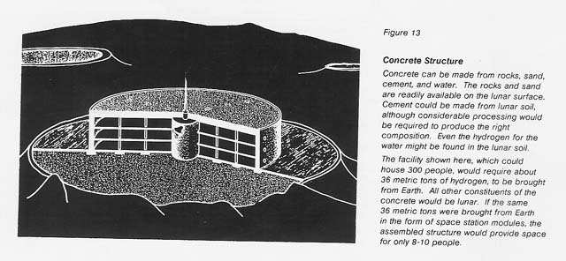 A possible product of interest might be concrete beams reinforced with glass fibers. If imported hydrogen could be used with perfect efficiency, each metric ton could yield 6 kilometers of beams with a cross section of 10 by 10 centimeters. The same amount of hydrogen could yield a wall 10 centimeters thick, 3 meters high, and 24 meters long. Thus, where bulk plus reasonable strength is required or where complex shapes are needed, concrete may be a plausible material to use. See figure 13.