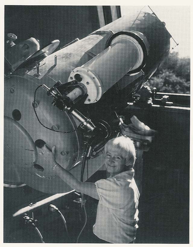 The search for asteroids is conducted with wide-field telescopes known as Schmidt telescopes. A few near-Earth asteroids are being found each year by a team including Eugene Shoemaker. Carolyn Shoemaker (shown here with the Schmidt instrument at the Palomar Observatory), and Eleanor Helin. The telescopes are scanned at the same rate as the Earth turns, so that on photographic plates the stars remain fixed points. Under these conditions, asteroids which are moving across the star field appear as streaks on the plates. The small size and scarcity of near-Earth asteroids makes their discovery a particularly tedious task.
