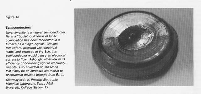 The production of more complex ceramics, composites, and even semiconductors may prove desirable at some point during the development of a lunar base. Although perhaps not within the scope of most easily obtainable materials, semiconductors produced from lunar materials could have a major effect on the means of producing electricity on the Moon. Silicon-based photovoltaic devices could be constructed using silicon reduced from silicate minerals, covered with thin glass layers made from silicon dioxide, supported by iron, aluminum, or glass structures, and supplied with iron wires to conduct currents. Lunar ilmenite has interesting semiconductor properties (see fig. 10) and might be usable in converting sunlight to electricity. The preparation of photovoltaic devices is now well known on Earth; however, adapting these processes to a lunar environment would be quite challenging.