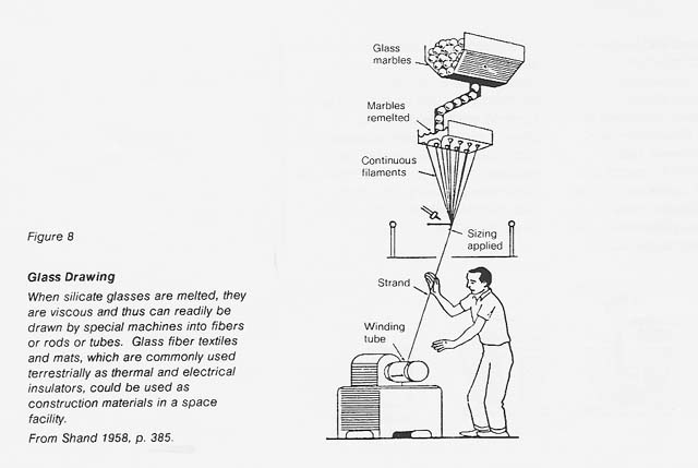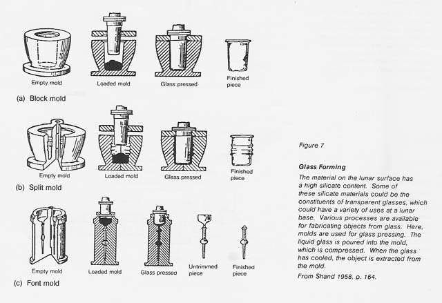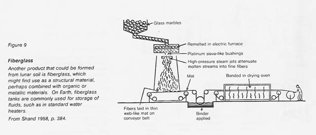 A variety of glasses and ceramics can be produced from bulk lunar materials or from separated components. Many glassy materials have been described in previous studies (Mackenzie and Claridge 1979, Criswell 1980). They include sintered (heated and pressed) regolith, quenched molten basalt, and transparent glass formed from fused plagioclase. No research has been carried out on lunar material or close simulants, so properties are not known in detail; however, common glass technologies such as molding and spinning seem feasible (fig. 7). Uses of glass include structural applications (bricks, slabs, beams, windows) and specialty applications (fiber strengtheners, insulation, heat shields, cables, light pipes). See figures 8 and 9.