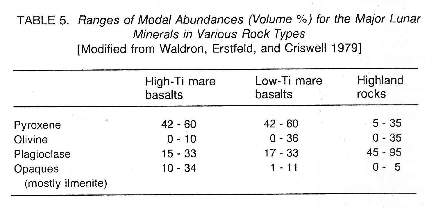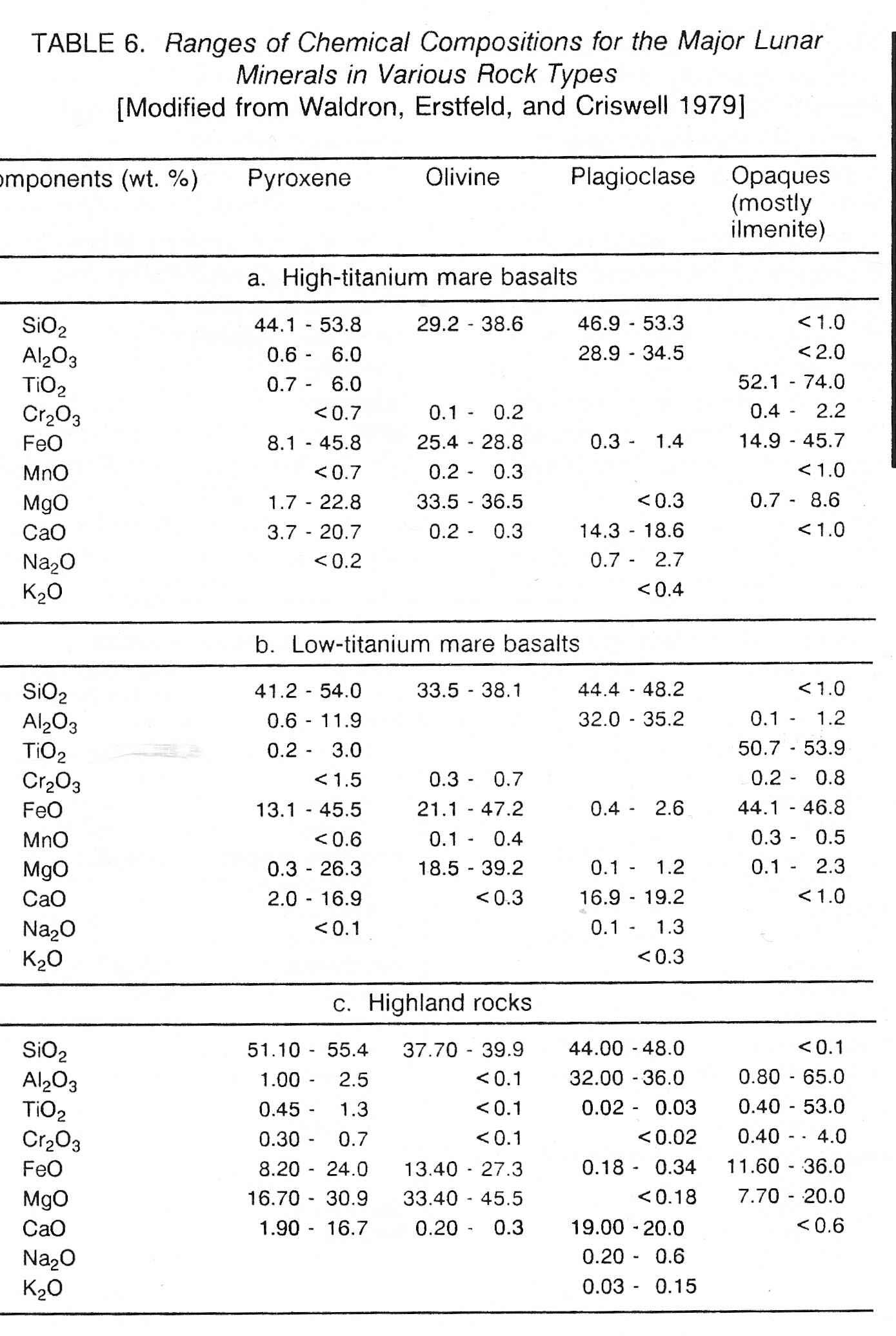 The mare rock types are composed primarily of plagioclase feldspars, clinopyroxenes, and ilmenite, with minor olivine, chromite/ulvospinel, iiihd tridymite/cristobalite (Taylor 1975). The highland rock types are composed primarily of plagioclase feldspars, orthopyroxenes, and olivine, along with minor ilmenite (Taylor 1975). The whole rocks represent a potential source of these minerals and someday may be used as a feedstock because they would supply material of relatively uniform physical characteristics, but their use would require an extensive infrastructure for mining and processing. The regolith fines will probably be exploited first because they have already been pulverized by meteoritic and cometary bombardment. The ranges of modal abundances for the major lunar minerals in various rock type~ are shown in table 5. The ranges of chemical compositions for the major lunar minerals in various rock types are shown in table 6.