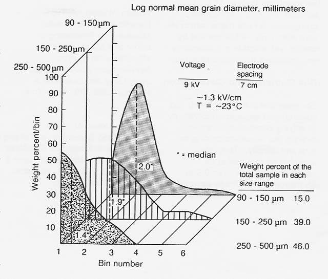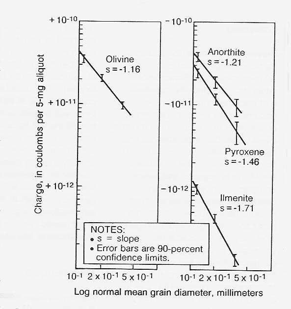 In 1984, I measured the trend of increasing charge-to-mass ratio with decreasing grain size in terrestrial analogs of common lunar regolith minerals and subsequently demonstrated electrostatic sizing of terrestrial ilmenite over the particle size range of 500 down to 90 micrometers (figs. 5 and 6). The previous year, Peter Castle, at the University of Ontario, demonstrated ac electrical sizing of conducting spheres in- a comparable size range. In both cases, air turbulence limited the smallest separable size to 90 micrometers. Accordingly, electrical sizing in a vacuum is indicated for grading of fines smaller than 90 micrometers.