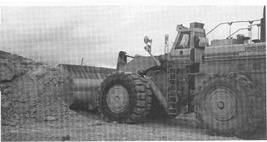 Muck Pile This is an example of a good muck pile, well-fragmented and largely remaining in one heap. Loading would be much more time consuming if the rock were widely dispersed, as it might be by conventional blasting in a low-gravity environment, without air resistance. The loading machine must have sufficient traction (created by both friction and weight) to be able to push the loading bucket into the muck pile. |