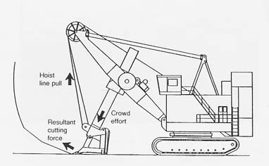 Simplified Force Diagram for a Conventional Mine Shovel The cutting force of a shovel is a function of hoist line pull, crowd effort, and front-end geometry. A large machine weight is needed to provide horizontal resistance to slippage during digging. Courtesy of J. D. Humphrey, Dresser Industries |