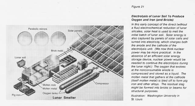 Accepting, then, that oxygen, rather than gigantic gems or gold, is likely to make the Moon's Klondike, we have chosen to investigate the extraction of oxygen from the lunar soil. Unlike the Klondike, this strike will not be made by the prospector who discovers the location of the oxygen ore, for it is everywhere on the Moon. This strike will be made by the inventor who discovers the robust, economical process for extracting the oxygen. We think the process that will pan out will be electrolysis of molten soil. (See figure 21.) We are investigating it because it is conceptually simple and because its nontraditional character fits the nontraditional lunar materials and conditions.