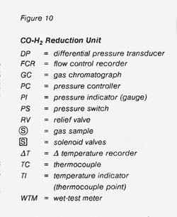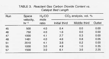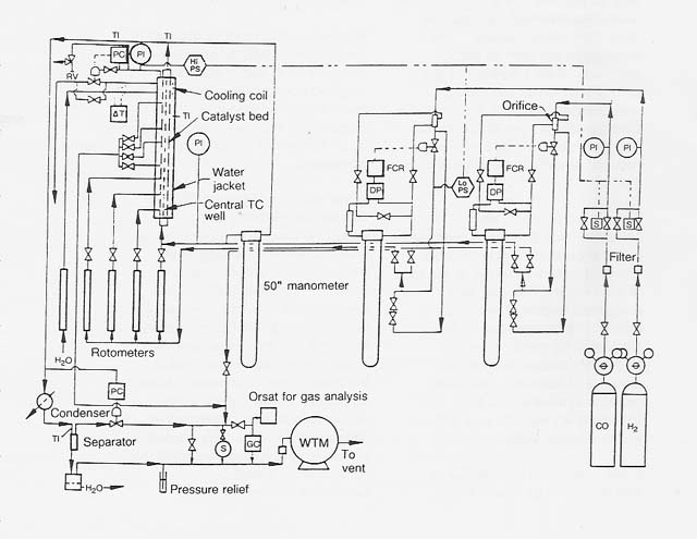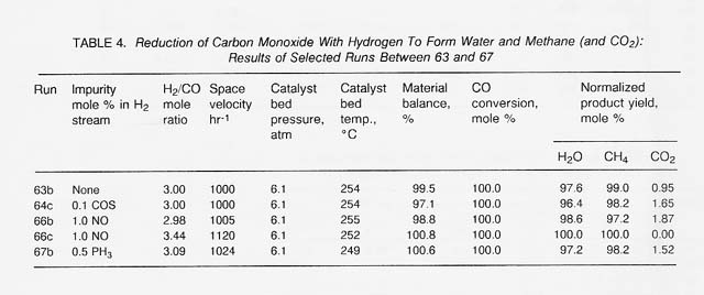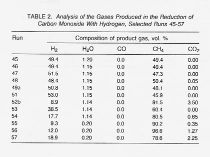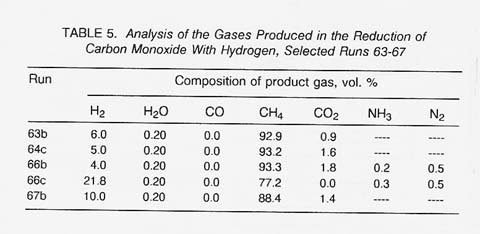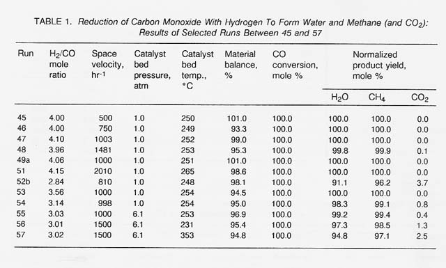The reduction of carbon monoxide with hydrogen to form methane and water was studied using a nickel-on-kieselguhr catalyst. A schematic flow diagram of the hydrogen-carbon monoxide reactor used in this program is shown in figure 10. The data for these runs are presented in tables 1 to 5 and figures 11 to 13. The various parameters that were studied are discussed in the following paragraphs.