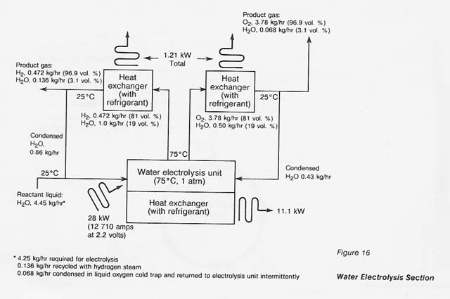 Most of the weight of the electrolysis unit is that of the refrigeration cooling system and radiators used to reject low- temperature heat. The details of this section are shown in figure 16. A high-pressure electrolysis unit will allow operation at higher temperatures and higher efficiencies--a situation advantageous for both weight and power savings. However, the high-pressure electrolysis unit itself is heavier than a low- pressure unit and, because of added corrosion problems, requires considerably more maintenance. Consequently, detailed tradeoff analysis of low- pressure versus high-pressure electrolysis is needed.