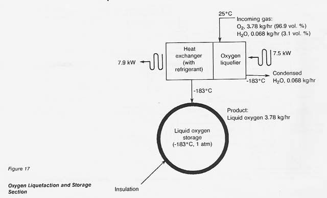 The oxygen liquefaction system is composed of Norelco type 12080 gas liquefiers. These units use helium as a refrigerant; some makeup helium is required. The details of this section are shown in figure 17. The amount of helium indicated in the tables is for a 1-year operation.