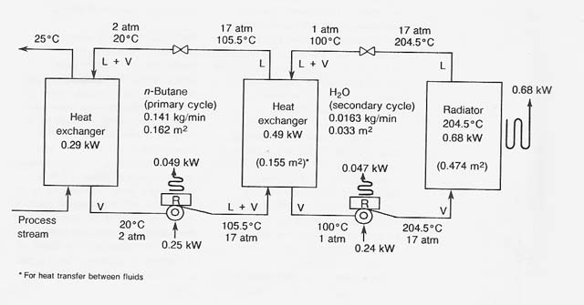The liquid n-butane absorbs the heat at 20°C (2 atm), vaporizes, and is compressed to 17 atm (105.5°C). The stream gives up its latent heat to liquid water at 100 ° C (1 atm) and condenses at 105.5°C (17 atm). Upon flowing through the expander, the n-butane partially evaporates until its temperature and pressure are lowered to 20°C (2 atm). It is then returned to the heat exchanger where the cycle is repeated.