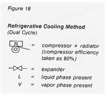 The flowsheet for the refrigeration system used for method 1 cooling is shown in figure 18. The numerical values given are for a heat rejection rate of 0.29 kW. These values may be multiplied by the factor 0/0.29 to obtain correct values for any desired heat rejection rate of 0 (kW).