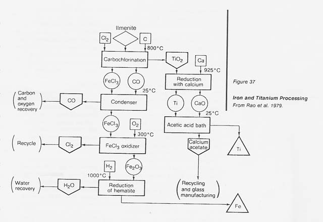 Another ilmenite reduction scheme based on a commercial process has been suggested for the Moon (Rao et al. 1979). In it the ilmenite is reacted with carbon to reduce FeO to Fe°. The iron from the ilmenite is chlorinated at 800°C in a fluidized bed reactor while the TiO2 remains unchanged.